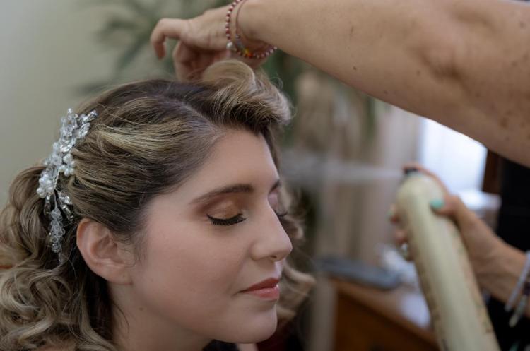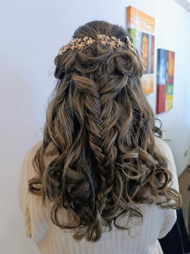 Su trabajo en la parte de maquillaje perfecto. Maquilla precioso , en la parte de peinado simple, ahí no está tan perfeccionada. Le falta detalle, el peinado aunque fue simple debe de ser...